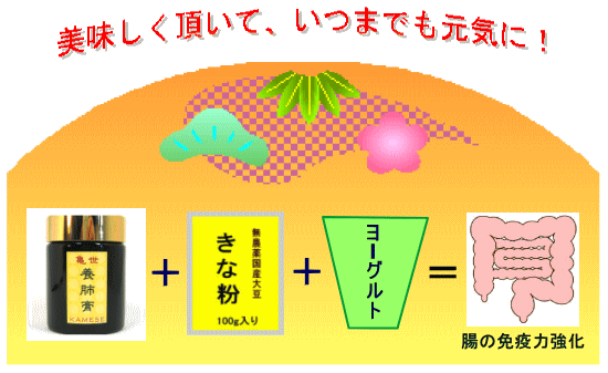 「亀世養肺膏」+「きな粉」+「ヨーグルト」腸内環境を整えれば、免疫力のアップにつながります。